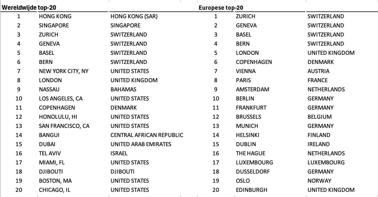 Hong Kong duurste stad ter wereld, Zürich duurste in Europa